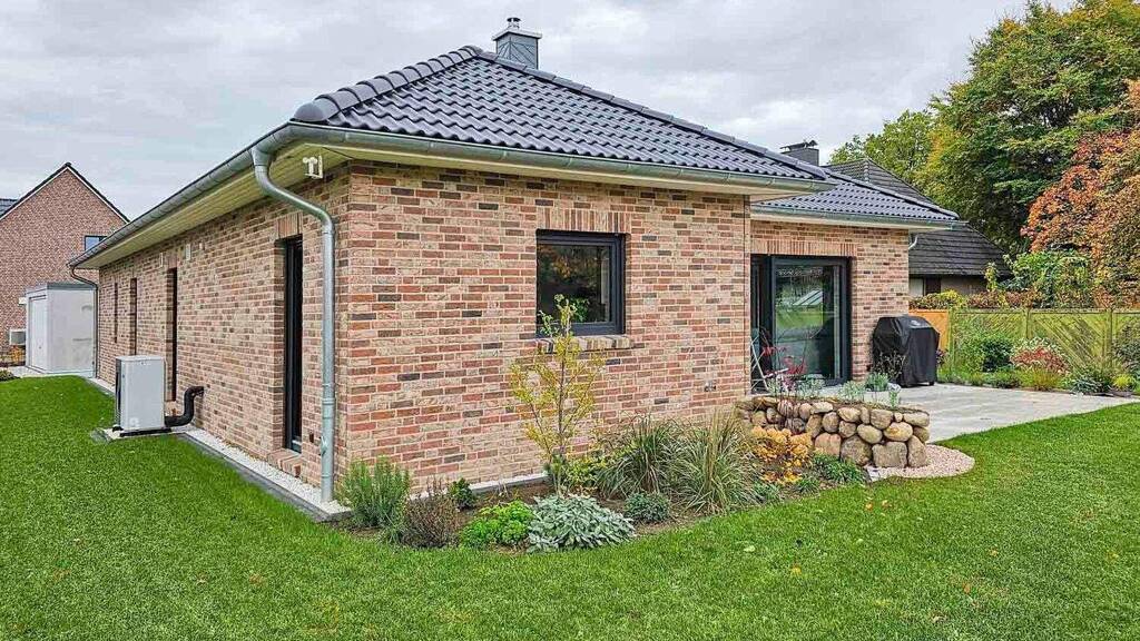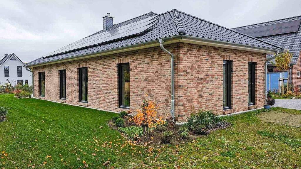 Komfort auf einer Ebene - 3-Zimmer-Winkelbungalow Niedrigenergiehaus EH 40 mit Wärmepumpe und PV - Neubauplanung