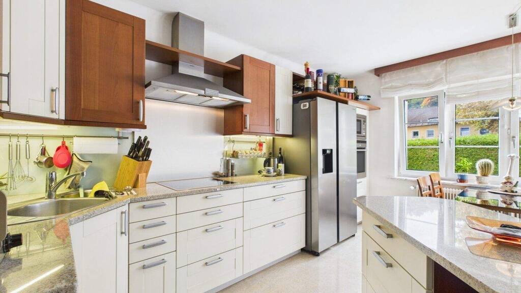 Die Wohnräume sind hell und freundlich gestaltet, mit Blick ins Grüne und direktem Zugang zum Garten. Die beiden Einbauküchen fügen sich harmonisch in das Wohnkonzept ein und bieten gemütliche Treffpunkte für Familie und Gäste.
