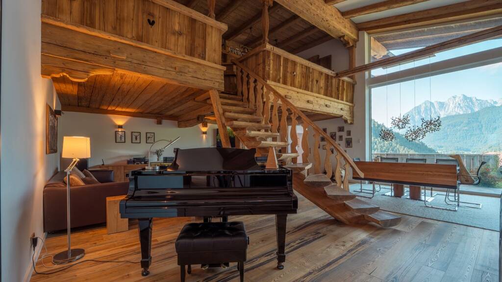 Im Obergeschoss befindet sich das großzügige Masterschlafzimmer mit Süd-West Balkon und Outdoor-Whirlpool. Das Masterbad ist als Wellness-Oase gestaltet - mit freistehender Badewanne, 2 x 2 m großen Dusche und Zugang zur Terrasse mit Saunahaus samt Panoramafenster und Blick auf die umliegende Bergwelt. Zwei weitere Schlafzimmer mit En-Suite-Bädern sowie ein zweites Gäste-WC bieten zusätzlichen Komfort. Ein besonderes Highlight ist die offene Galerie mit Altholz-Bar und großzügigem Essbereich für 8-10 Personen.