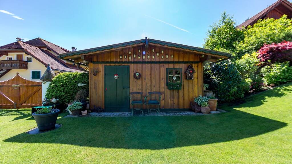 Der weitläufige Garten ist ein weiterer Höhepunkt: Ein großer Teich mit Pavillon schafft eine ruhige Oase, während ein Holzhaus praktischen Stauraum für Gartengeräte und Fahrräder bietet. Für die Bewässerung sorgt ein großer unterirdischer Tank, der Regenwasser sammelt und nachhaltig nutzt.
