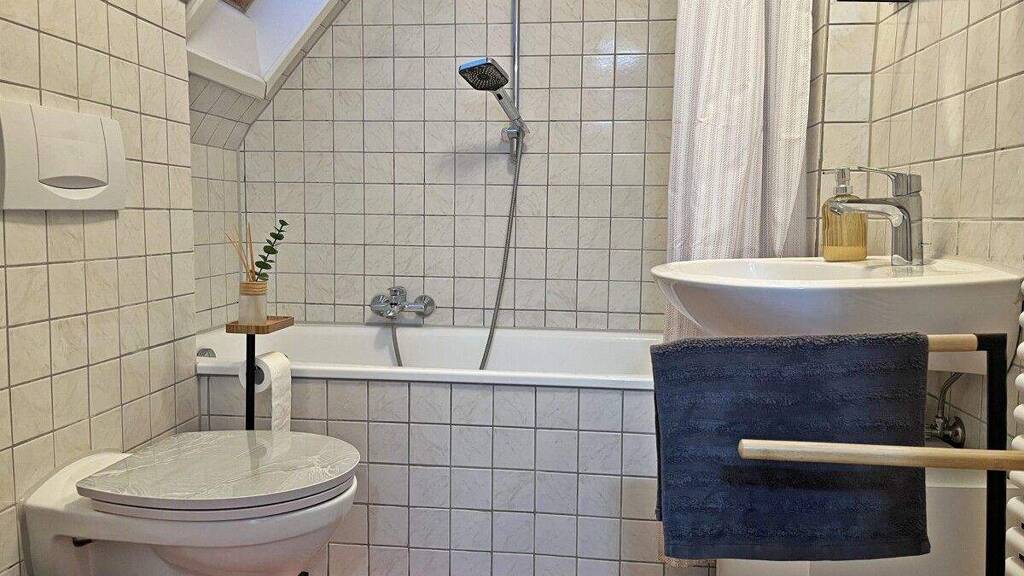 Das Tageslichtbadezimmer ist funktional und geschmackvoll gestaltet und verfügt über eine Badewanne, eine Toilette sowie einen Handtuchheizkörper . Die durchdachte Aufteilung sorgt für eine angenehme Nutzung aller Räume.