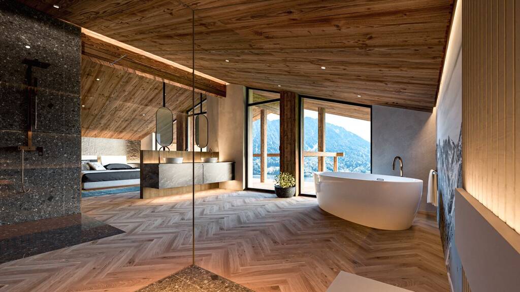 Das Chalet verfügt über 3 elegante Bäder und bietet durch die edlen Materialien und hochwertige Ausstattung höchsten Komfort. Der offene Kamin im Livingroom schafft in den kühleren Monaten eine gemütliche Atmosphäre. Ein praktischer Schrankraum und die Tiefgarage mit 4 Stellplätzen bieten zudem viel Stauraum und Komfort.