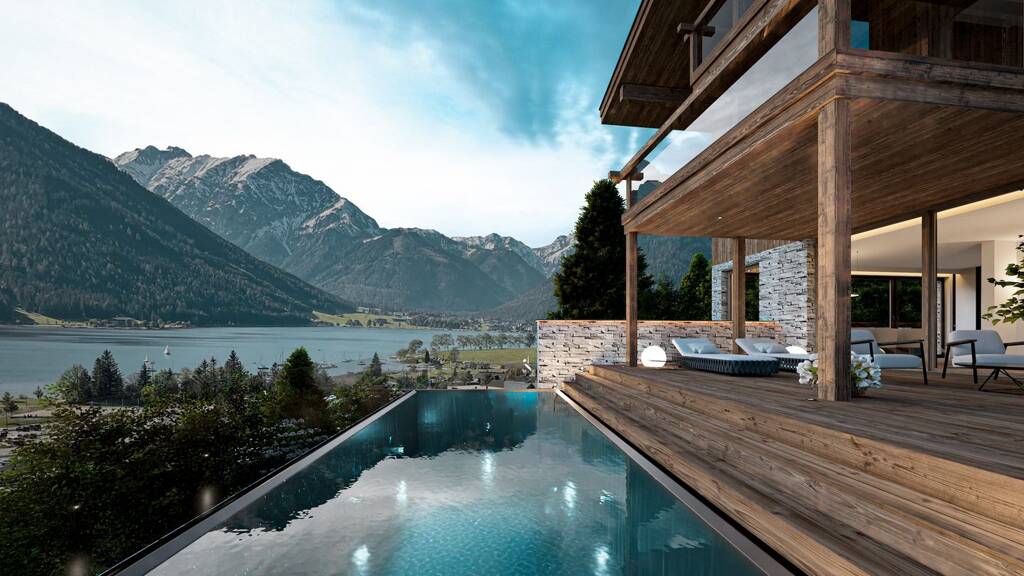 Dieses exklusive Chalet mit einer Wohnfläche von 191 m² bietet einen atemberaubenden Blick auf den Achensee und vereint rustikalen Charme mit luxuriösem Komfort. Die Fassade aus hochwertigem Altholz und edlem Stein schafft eine perfekte Symbiose aus traditionellem Alpenstil und modernen Akzenten. Der offene Dachstuhl und die großen Fensterfronten sorgen für eine lichtdurchflutete, einladende Atmosphäre und einen faszinierenden Ausblick auf den Achensee.