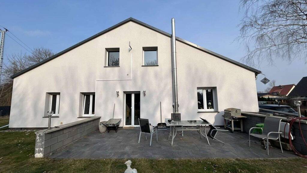 Zum Verkauf steht ein modernes Einfamilienhaus aus dem Jahr 2016 mit zwei Gewerbeeinheiten auf einem 1.729 m² großen Grundstück. Die Wohnfläche von 165 m² bietet vier Zimmer, darunter drei Schlafzimmer, eines mit begehbarem Kleiderschrank. Der offene Wohnbereich mit Kamin grenzt an eine hochwertige Nolte-Einbauküche mit Kücheninsel. Ein großes Badezimmer mit Dusche, Badewanne und Fenster, ein Hauswirtschaftsraum sowie ein Abstellraum sorgen für Komfort und viel Stauraum. Eine kleine Büro-Spart hinter der Küche ergänzt das Raumangebot.