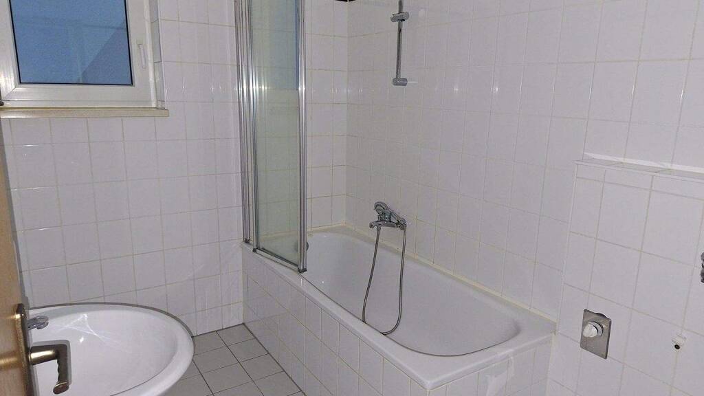 Das Bad ist mit Boden-, und Wandfliesen, Waschtisch, WC , WM Anschluss , Fenster und einer Wanne mit Duschabtrennung ausgestattet.