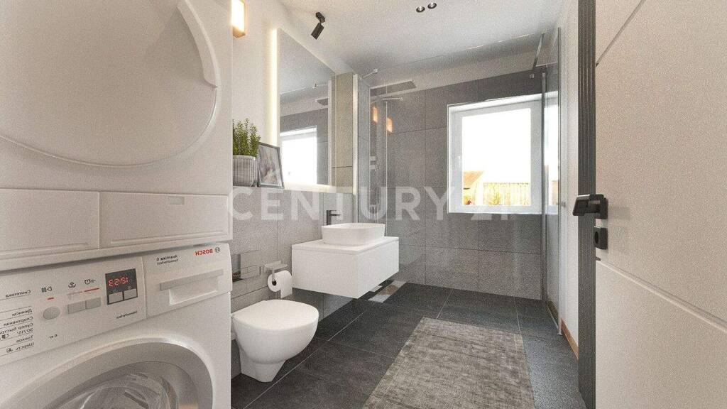 Das Badezimmer ist hochwertig ausgestattet und verfügt über eine Badewanne sowie einen Anschluss für Waschmaschine und Trockner.
