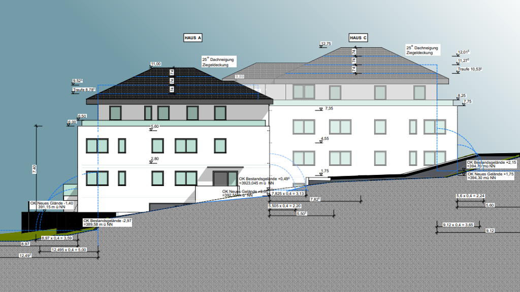 Die Baugenehmigung wurde für eine zu realisierende Wohnfläche von insgesamt ca. 1.333m² - aufgeteilt auf insgesamt drei Mehrfamilienhäuser - erteilt. Zudem bietet die Tiefgarage mit 23 Stellplätzen, sowie die sieben Außenstellplätzen den Bewohnern ausreichend Parkmöglichkeiten.