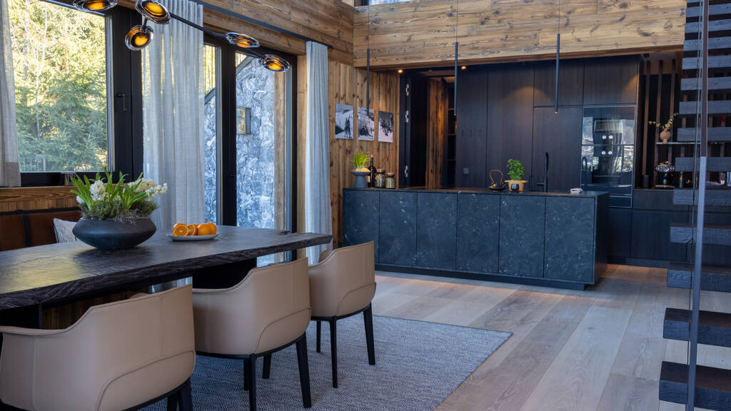 Die Offene Küche und der daran angeschlossene Essbereich laden zum gemeinsamen Kochen ein. Die Wohnbereiche mit Sichtdachstuhl aus Altholz, offenem Kamin und angeschlossenem Freisitz oberhalb der Galerie sind offen angelegt und garantieren traumhafte Ausblicke durch großzügige Glasfronten. Ein privater SPA Bereich samt Sauna vollendet diese Oase der Entspannung.