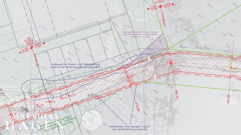 Das Grundstück ist am westlichen Ende mit div. Geh-, Fahr- und Leitungsrechten belastet. An der entsprechenden Stelle wurde bereits eine Straße in Natura errichtet. Im Zuge des Verkaufs, ist die Dienstbarkeit für GSt. 11395/15 noch zu verbüchern. Dies ist derzeit aufgrund Eigentümeridentität noch nicht möglich. Gleichzeitig wird am südöstlichen Ende noch eine Zufahrt als Dienstbarkeit einzutragen sein (vgl. Plan). Sämtliche Verträge hierzu liegen vor.
