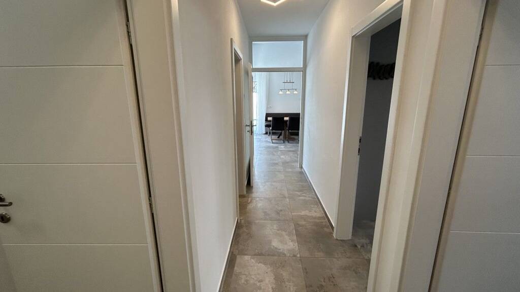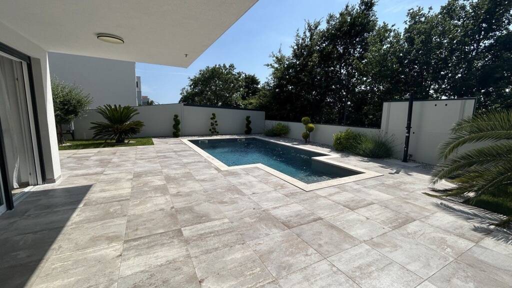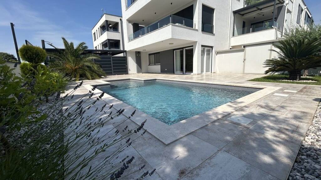 Zum Verkauf steht eine Wohnung in guter Lage in Novigrad, 1.000 m vom Meer und einer schön dekorierten Terrasse sowie 1.200 m vom Stadtzentrum entfernt. Die Wohnung befindet sich im Erdgeschoss des Gebäudes und hat eine Bruttofläche von 79 m2 (netto 69 m2). Die Wohnung besteht aus einer Eingangshalle, einem Badezimmer, einem Abstellraum, 2 Schlafzimmern und einem offenen Raum, in dem sich eine Küche mit Esszimmer und ein Wohnzimmer mit Zugang zu einer überdachten Terrasse und einem Garten von 180 m2 befinden. Der Garten ist wunderschön dekoriert und jedes Detail ist sorgfältig geplant. Im Garten gibt es einen beheizten Pool mit Elektrolyseanlage (Salzwasser im Pool). Im Garten gibt es außerdem eine Solardusche und einen großen geschlossenen Abstellraum von 24 m2, in dem sich ein Maschinenraum, ein Schwimmbad und ein Abstellraum befinden. Der Garten verfügt über ein automatisches Rasenbewässerungssystem, ist schön eingezäunt und bietet viel Privatsphäre. Die Wohnung verfügt über einen überdachten Parkplatz von 40 m2 für 4 Autos. Jedes Zimmer in der Wohnung verfügt über eine Klimaanlage (insgesamt 3) und das Badezimmer verfügt über eine Fußbodenheizung. Die Wohnung kann zu Wohn- oder Touristenzwecken genutzt werden.