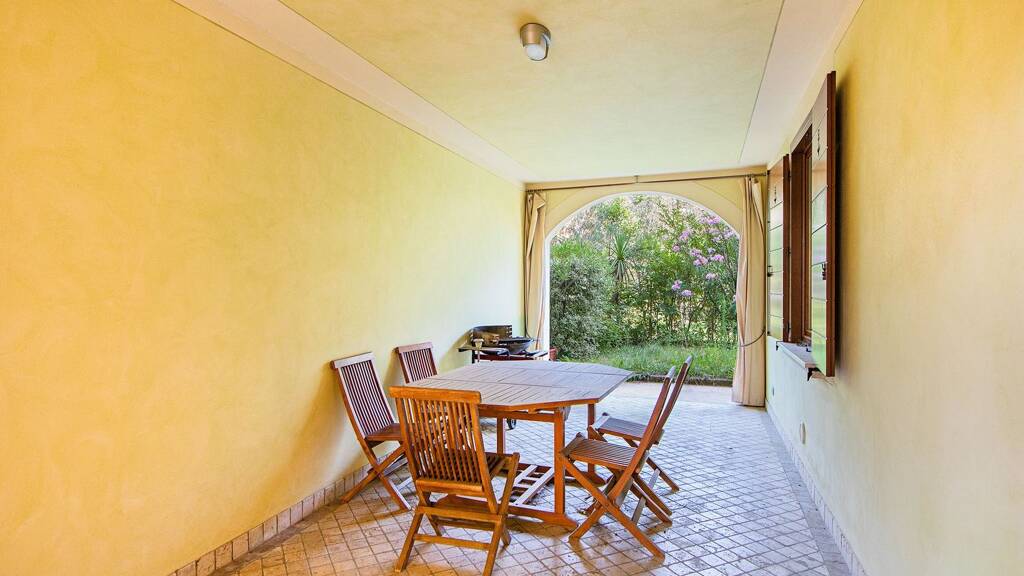 Eine elegante Veranda öffnet sich zu einem privaten Garten, der zu jeder Jahreszeit einen perfekten Platz für das Leben im Freien bietet. Ideal für Mahlzeiten im Freien, entspannende Momente oder zum Spielen mit den Kindern.