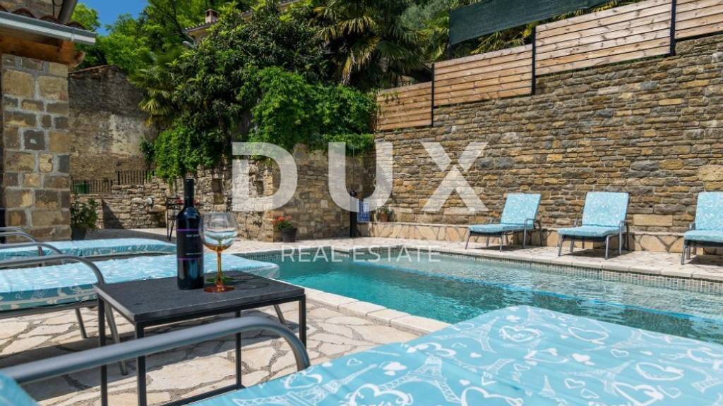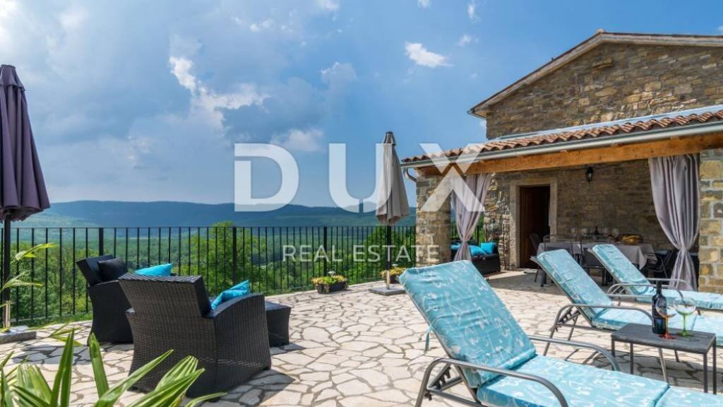 In der Nähe von Oprtlje steht ein Steinhaus mit Swimmingpool und schöner Aussicht auf Motovun zum Verkauf.