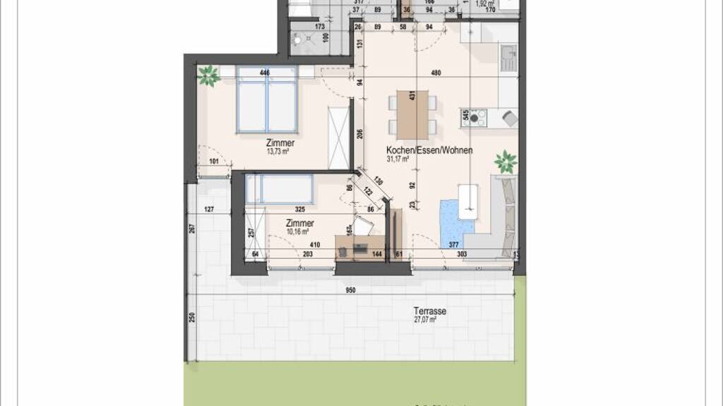 Die Nutzflächen der Wohnungen liegen zwischen: 43m² - 80m² und bieten eine offene Wohn-Essküche und 1-3 Zimmer.