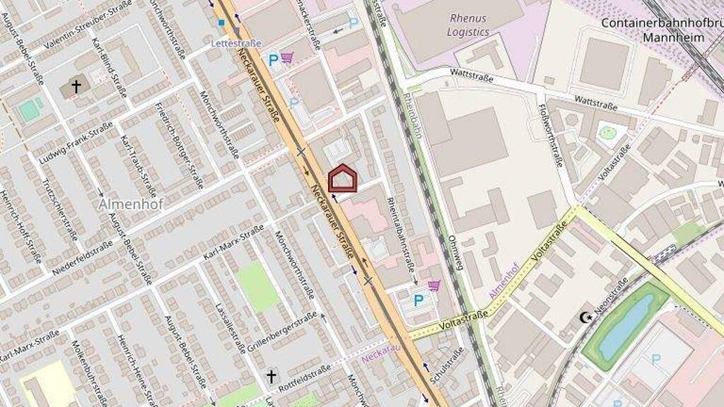 Das Gebäude befindet sich im Stadtteil Mannheim-Neckarau. In der Nachbarschaft des Objekts finden Sie Einrichtungen des täglichen Bedarfs sowie ein gastronomisches Angebot. Handelsketten wie Aldi, Metro, Media-Markt und Bauhaus befinden sich ebenfalls in der Umgebung. Die Autobahnen A5 und A6 sind in wenigen Minuten erreicht. Die Tramhaltestelle Lettestraße, Voltastraße und der Bahnhof MA-Neckarau liegen fußläufig entfernt.