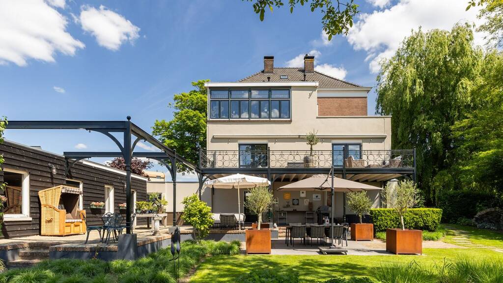 the outdoor space forms a natural extension of the home. the garden, redesigned in 2022, has been thoughtfully arranged with a focus on tranquillity and usability. clean lines are combined with natural planting, and multiple terraces offer both sun and shade throughout the day. the veranda, featuring a timber beam ceiling and prepared for an outdoor kitchen and wellness facilities, enhances the enjoyment of outdoor living. to the side of the plot, a second garden area with lawn and a graceful weeping willow adds to the sense of greenery and privacy.
