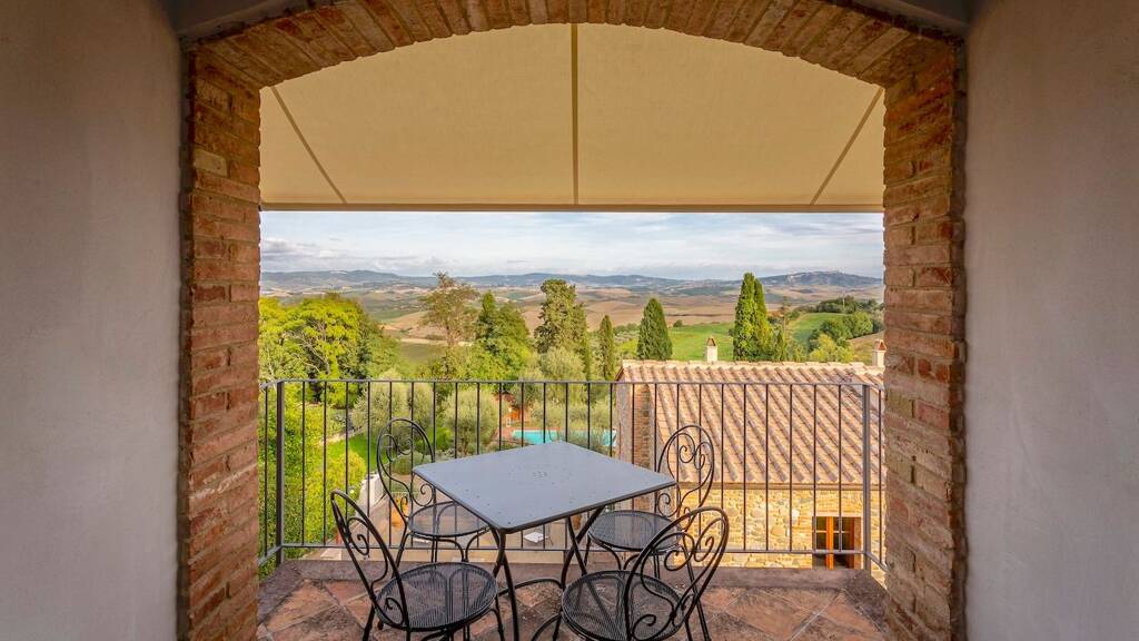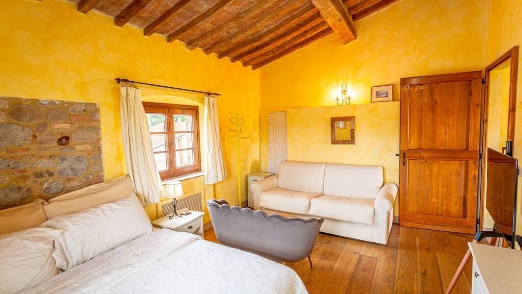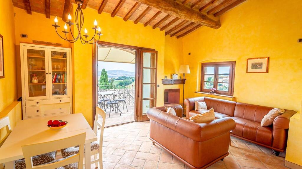 Die Wohnung verfügt über einen Wohn-/Essbereich mit Küche, eine fantastische Panoramaterrasse mit atemberaubender Aussicht auf die Landschaft von Lajatico und Volterra; zwei Doppelzimmer, ein Badezimmer und ein Dachboden, der derzeit als Abstellraum genutzt wird. Die Wohnung besticht durch Balkendecken, Terrakottaböden sowie Türen und Fenster aus Kastanienholz. Alle Zimmer sind sehr hell und geräumig. Die Wohnanlage ist an die kommunale Wasserversorgung angeschlossen. Die Heizung sowie die Kühlung funktioniert elektrisch. Internetanschluss ist vorhanden.