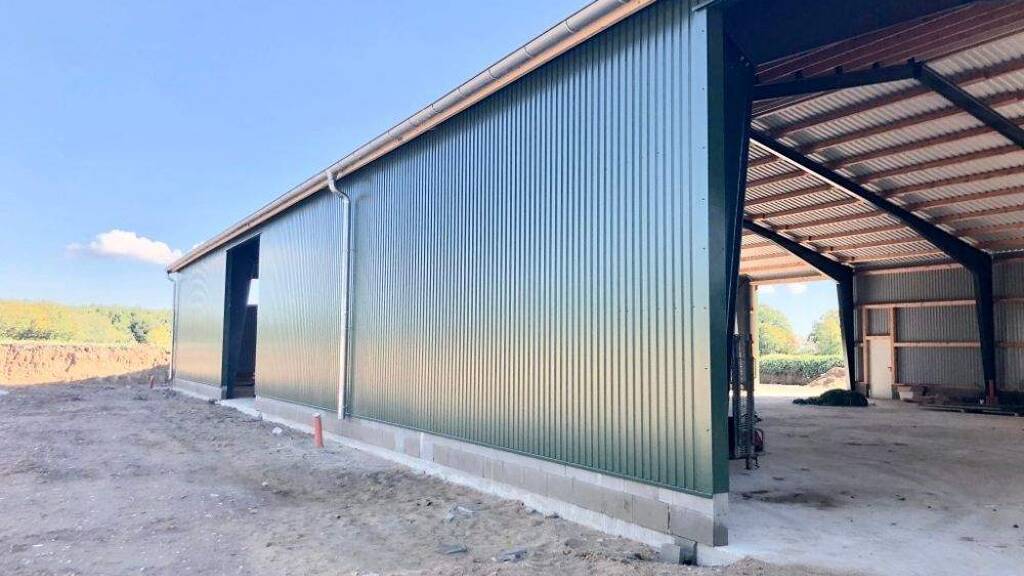 Die Außenwände haben, wie auch die Eindeckung des Satteldaches, kunststoffbeschichtete Trapezbleche.