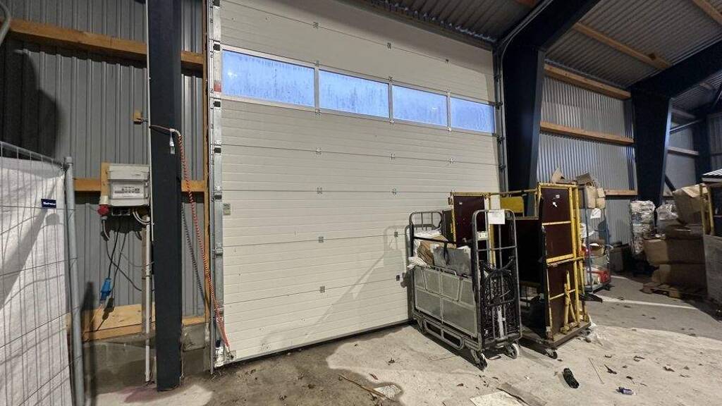 Die Tore lassen sich elektrisch öffnen. Für den kurzen Zugang in die Halle sind normale Eingangstüren vorhanden.
