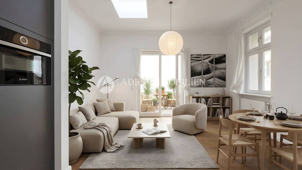 Die offene Wohnküche ist mit einer hochwertigen maßgefertigten Einbauküche inklusive Elektrogeräten von Bosch ausgestattet und bildet das kommunikative Herzstück der Wohnung.