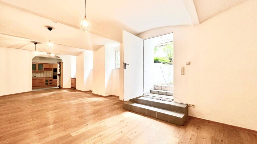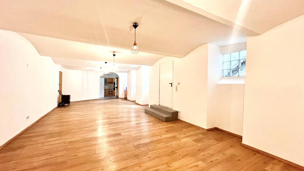 Der Zugang erfolgt über wenige Stufen direkt vom Innenhof. Der großzügige Hauptraum mit Gewölbedecke und mehreren Fenstern eignet sich ideal als Atelier, Büro oder Praxis. Die Einheit verfügt über eine vollausgestattete Küche sowie ein Badezimmer mit Dusche, Waschbecken und WC.