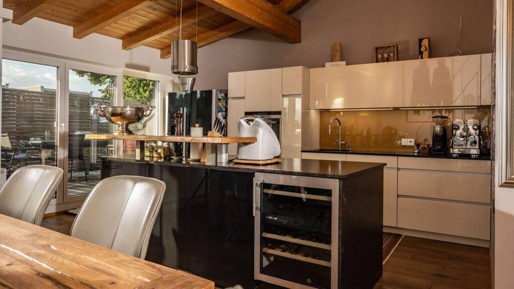Das Herzstück bildet der rund 55 m² große Wohn-, Ess- und Küchenbereich – ein Ort zum Leben und Wohlfühlen. Handgehobelter Parkett, eine hochwertige Markenküche mit Stein-Arbeitsplatte, Kochinsel, Side-by-Side Kühlschrank und ein integrierter Liebherr-Weinklima verbinden Design, Funktionalität und Stil auf höchstem Niveau.
