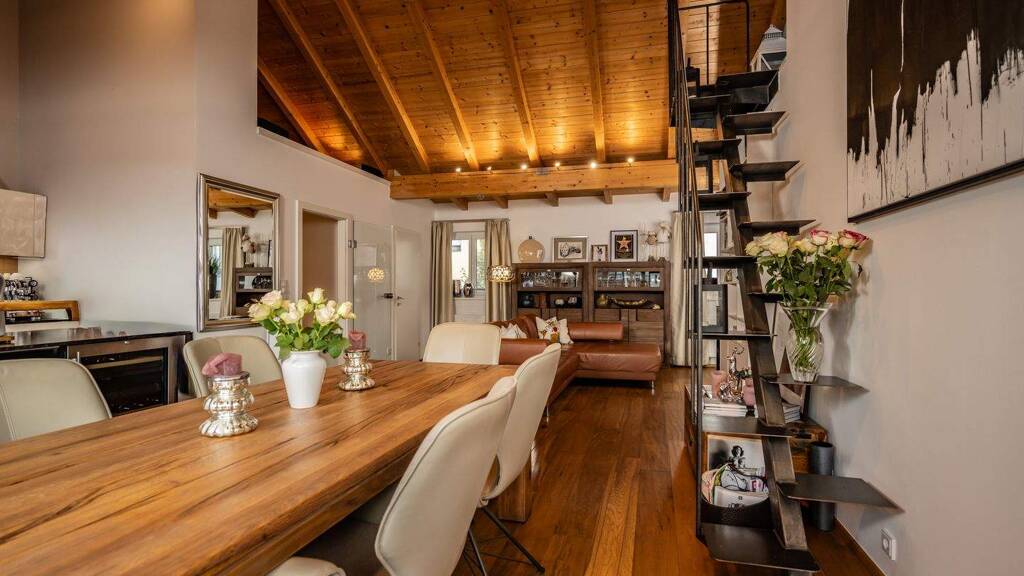 Der ehemalige Dachboden wurde vollständig neu ausgebaut und zu einer einzigartigen Wohnwelt mit rund 100 m² Wohnfläche verwandelt. Raumhöhen bis zu 4,4 Metern, ein imposanter offener Sichtdachstuhl und großflächige Fenster verleihen dem Zuhause ein warmes, lichtdurchflutetes Ambiente mit viel Großzügigkeit.
