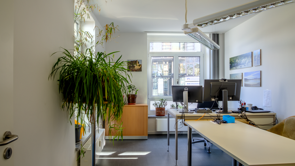 Die Gewerbeeinheit verfügt über vier großzügige Büroräume, eine Teeküche sowie getrennte Damen- und Herren-WCs. Das große Hauptbüro mit über 62 m² Fläche bietet eine flexible Nutzung, beispielsweise als Großraumbüro, Schulungsraum oder repräsentativer Empfangsbereich.