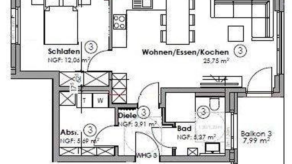 1. Obergeschoss, rechts: - Flur - offene Küche - Wohn-Esszimmer mit Zugang zum Balkon - Schlafzimmer - Badezimmer mit ebenerdiger Dusche, Toilette und Waschbecken - Abstellraum mit Anschlüssen für Waschmaschine und Trockner - Einbauküche 90EUR monatlich - Stellplatz 50EUR monatlich - Fahrradraum