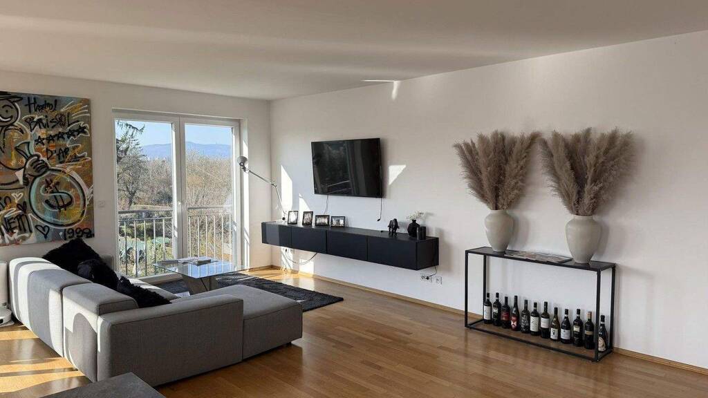 Das Herzstück der Wohnung bildet der großzügige Wohn- und Essbereich mit direktem Zugang zu einem Balkon und einem einzigartigen schönen Blick ins Grüne - eine in Frankfurt seltene Kombination aus urbanem Wohnen und naturnaher Umgebung. Fußbodenheizung und Parkett in allen Zimmern sowie elektrische Rollladen in den Räumen unterstreichen die Hochwertigkeit der gesamten Wohnung.