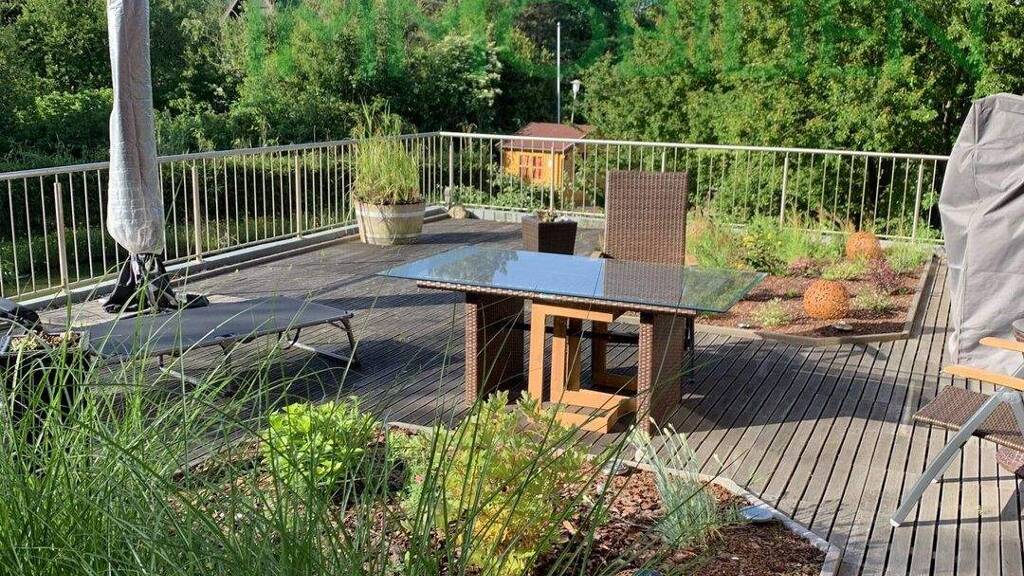 Ein besonderes Highlight ist die ca. 70 m² große Dachterrasse, die einen freien Blick ins Grüne eröffnet - über die umliegenden Felder bis hin zum oberen Wanderweg. Sie bietet einen außergewöhnlichen Rückzugsort mit hoher Privatsphäre und ist ideal für entspannte Stunden im Freien, für Hundebesitzer ebenso wie für Menschen, die Ruhe, Natur und Weite schätzen. Ob Sonnenbaden, Lesen oder gesellige Abende - dieser Außenbereich erweitert den Wohnraum auf besondere Weise.