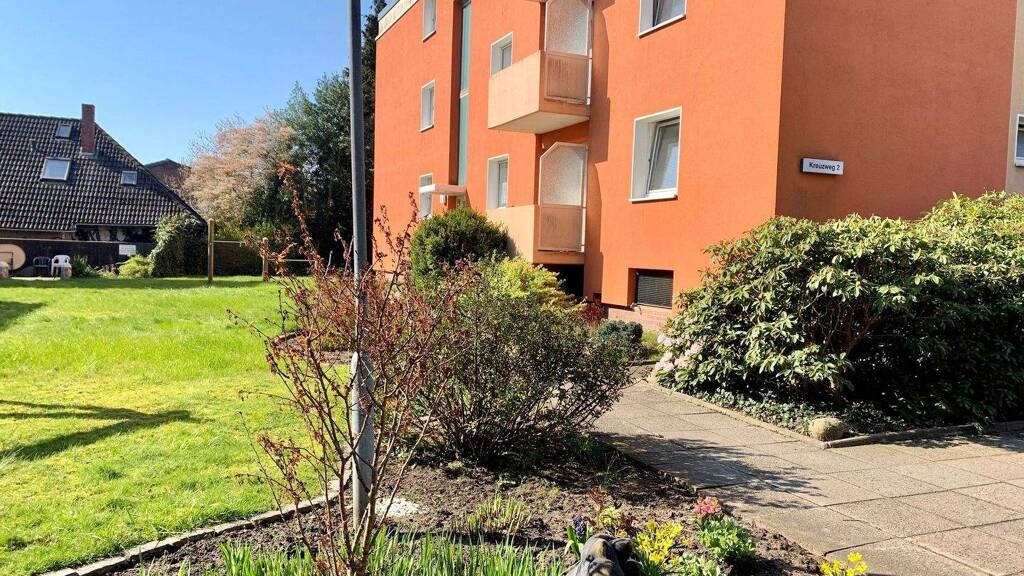 Die gepflegte Wohnanlage im Kreuzweg liegt sehr ruhig und abgeschirmt von der Straße in zweiter Baureihe. Die Gebäude sind von einer gepflegten Grünanlage umgeben, die auch einen Spielplatz umfasst.