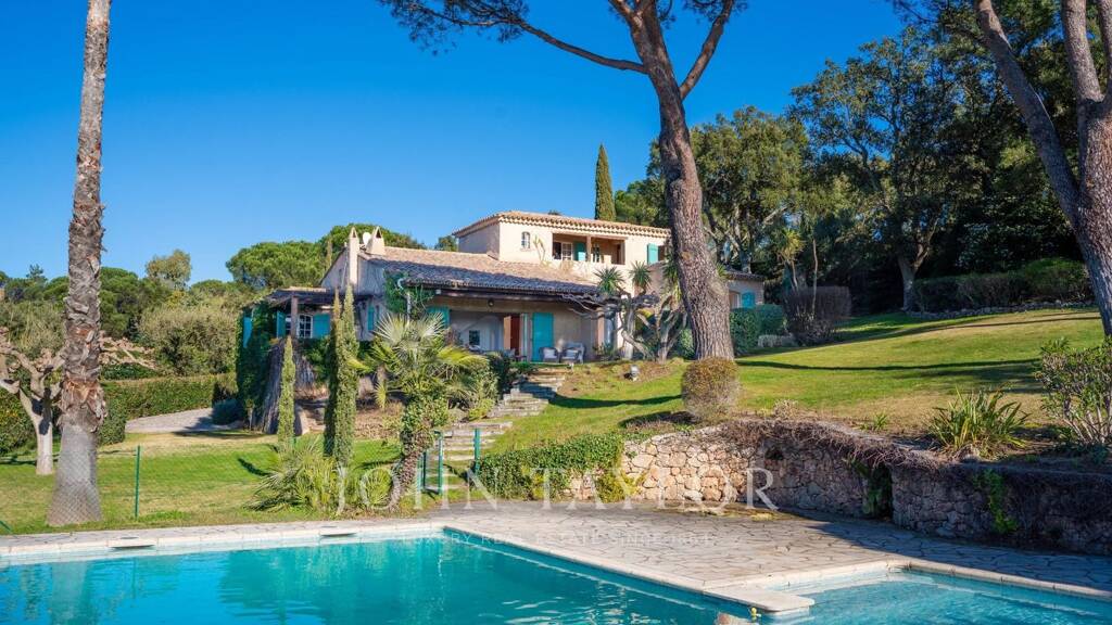 Située dans un domaine privé sur les hauteurs de Gigaro, cette propriété bénéficie d'une vue mer et collines à travers les pins parasols.