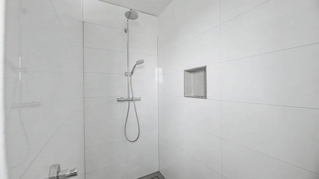 Es schließt sich dann das sehr schöne Vollbad mit Doppelwaschtisch und Einlaufdusche an.