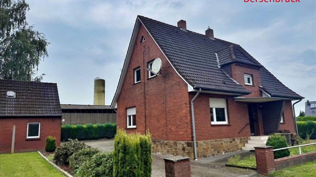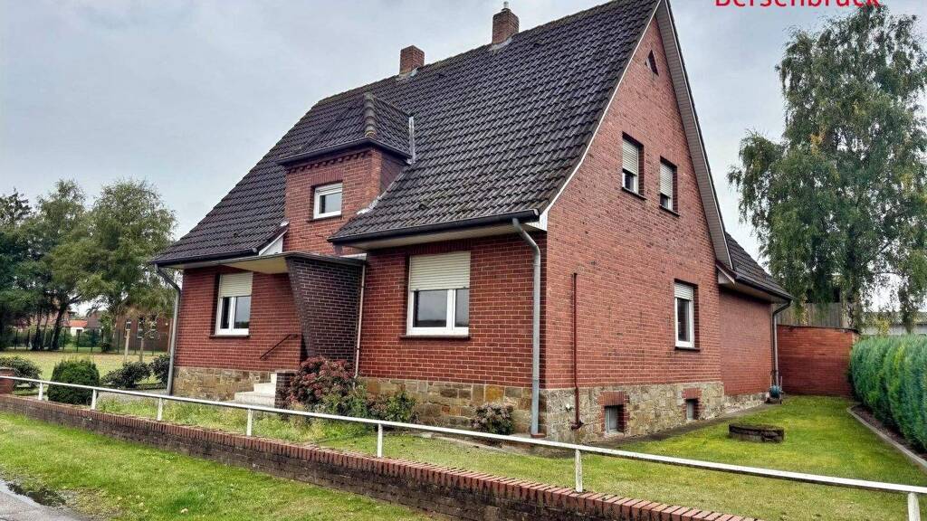 Dieses geräumige Wohnhaus im Bramscher Außenbereich bietet auf ca. 700 m² Grundstück viel Platz und ausreichend Wohnfläche. Erbaut wurde das Gebäude ursprünglich als Einfamilienhaus ca. im Jahre 1929, ein An- und Ausbau des Wohnhaus fand ca. im Jahre 1979 statt. Weiterhin befindet sich auf dem Grundstück ein älteres Stall- und Wirtschaftsgebäude ca. aus dem Jahre 1933 sowie im hinteren Teil des Grundstückes eine Garage (ca. 1958). Das Erdgeschoss bietet Ihnen auf ca. 120 m² Wohnfläche eine Küche sowie vier weitere Räume, die als Wohnzimmer, Esszimmer oder auch als Schlafzimmer genutzt werden können. Zudem sind hier unten ein Duschbad, ein Abstellraum sowie zwei Hausflure vorhanden. Das Dachgeschoss ist voll ausgebaut. Es befinden sich im oberen Geschoss eine zentrale Küche, ein großzügiges Wohnzimmer, zwei Schlafzimmer, ein Badezimmer mit Dusche und Badewanne, eine separate Toilette, ein Abstellraum und ein Flur. Ausreichend Platz u.a. für die Heizung und die Öltanks stellt der Teilkeller mit drei Räumen zur Verfügung. Für Ihre Fahrzeuge gibt zwei Garagen. Ein freistehendes, massiv gemauertes Wirtschaftsgebäude auf dem Grundstück bietet ausgezeichnete Möglichkeiten für eine Werkstatt bzw. als Abstellfläche für Fahrräder oder Gartengeräte. Das Eigentumsgrundstück wird noch vermessen. Der große Ziergarten lädt zum Wohlfühlen ein und kann nach Ihren Vorstellungen gestaltet werden. Haben wir Ihr Interesse geweckt? Dann kontaktieren Sie uns, um das ausführliche Exposé mit Grundrisszeichnungen und Liegenschaftskarte zu erhalten. Gerne koordinieren wir für Sie einen Besichtigungstermin.