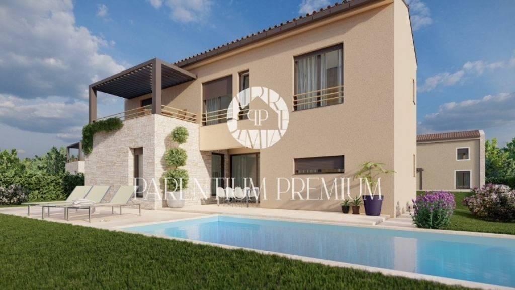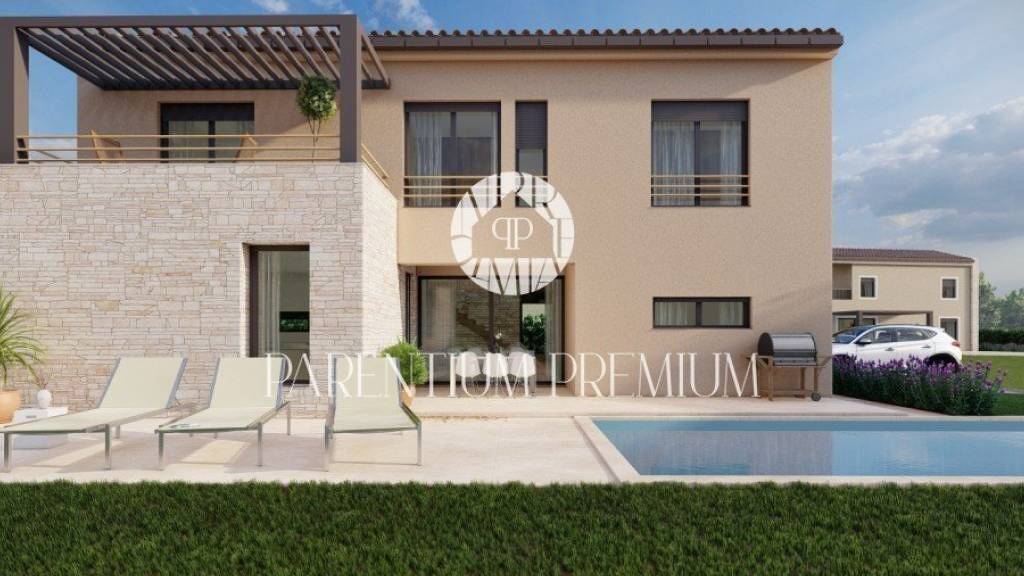 Villa mit Pool 3 km von Baderna, 15 km vom Zentrum von Porec und dem Meer entfernt. Die Villa hat eine Gesamtfläche von 148.84 m2, liegt auf einem Grundstück von 698 m2 und erstreckt sich über zwei Etagen. Das Erdgeschoss besteht aus einem Eingansraum, einem Schlafzimmer, einem Badezimmer, einem Abstellraum, einer Küche mit Esszimmer und Wohnzimmer mit Ausgang auf bedachte Terrasse die zum Pool führt. Die Treppe führt auf die 1. Etage, wo sich ein Flur befindet, drei Schlafzimmer jedes mit eigenem Badezimmer und ein Schlafzimmer hat seine eigene Terrasse mit Pergola. Im Garten befindet sich ein Sonndeck mit Schwimmingpool von 36,65 m2, die Wege werden im Garten verlegt und der Garten wird Bewässerung haben. Die Villa fügt über elektrische Fußbodenheizung und hat Klimaanlagen in allen Räumen, die Zimmerei besteht aus dreischichtigem PVC-Glas mit Moskitonetzen und elektrischen Jalousienen. Die Villa verfügt über zwei Parkplätze, die mit Strom für Autoladegerät versorgt werden. Das voraussichtliche Ende der Arbeiten ist im Frühjahr 2026. Diese Villa ist die optimale Lösung für die Wohnungsfrage oder als Investition. Der Käufer zahlt keine 3% Immobilientransaktionssteuer, da die Villa von einer juristischen Person verkauft wird.