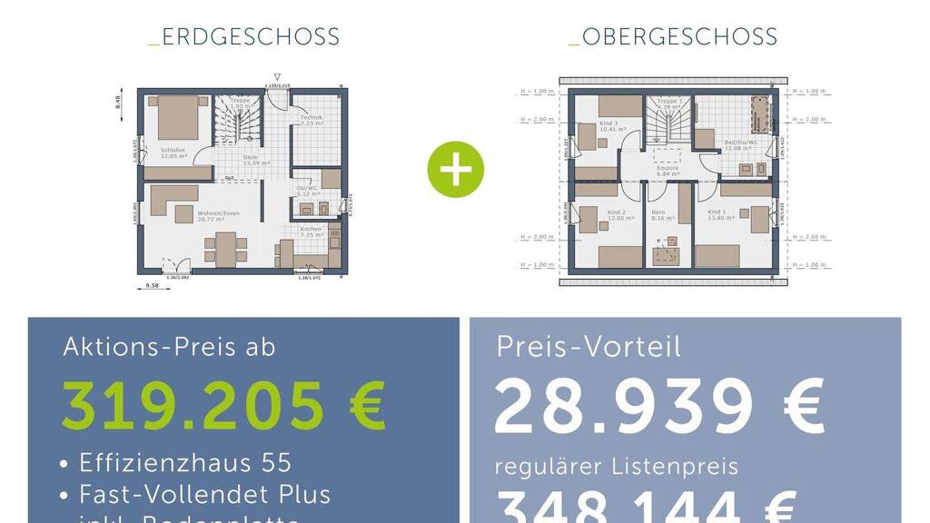 - Bodenplatte inkl. Effizienzhaus 55 Perimeter-Dämmung unterhalb der Bodenplatte sowie stirnseitig - Klima-Komfort-Bauweise für das Effizienzhaus 55 - Zimmermannsmäßiges Pfettendach - Photovoltaik-Vorbereitung für die Ausführung eines Photovoltaik-Systems - Komplette Elektro-, Sanitär- und Heizungs-Installation inkl. Grundinstallation für das Schwabenhaus auf Schwabenhaus-Bodenplatte bzw. -Keller* - Zukunftsweisende Elektro-Installation* - Abgeschirmte Lichtleitungen für moderne, störungsfreie Beleuchtung und Lichtszenarien - Rollläden im Erd- und Obergeschoss Ihres Schwabenhauses - Doppel-Wärmepumpe Eco* für Heizen, Kühlen, Lüften, Luftreinigung und Warmwasser - Schwimmender Estrich mit Wärmedämmung* - Blower-Door Test zur Überprüfung der Luftwechselrate* - Klima-Komfort-Außenwand mit über 200 Putzfarben zur Auswahl - Hochwertige, mehrschichtige Holz-Haustür in vielfältigen Design-Lösungen, mit Sicherheitsschließzylinder, 5-fach- Sicherheits-Verriegelung und 3-Scheiben-Wärmeschutzverglasung - Kunststoff-Fenster mit 3-Scheiben- Wärmeschutzverglasung - Dachflächenfenster mit Kipp- und Schwingfunktion sowie elektrischen Rollläden*, wenn laut Grundriss enthalten - Außenfensterbänke aus Naturstein - Innenfensterbänke aus Kunst- oder Naturstein* - Massiv-Vollholz-Treppe - Protect Versicherungs-Paket mit Wohngebäude-Versicherung inkl. Elementarschutz, Haus- und Wohnungs-Schutzbrief, Bauleistungs-Versicherung und Bauherren-Haftpflichtversicherung sowie Job-Protect Versicherungs-Paket - 10 sowie 30 Jahre Gewährleistung gemäß Definition in der Schwabenhaus Bau- und Leistungsbeschreibung