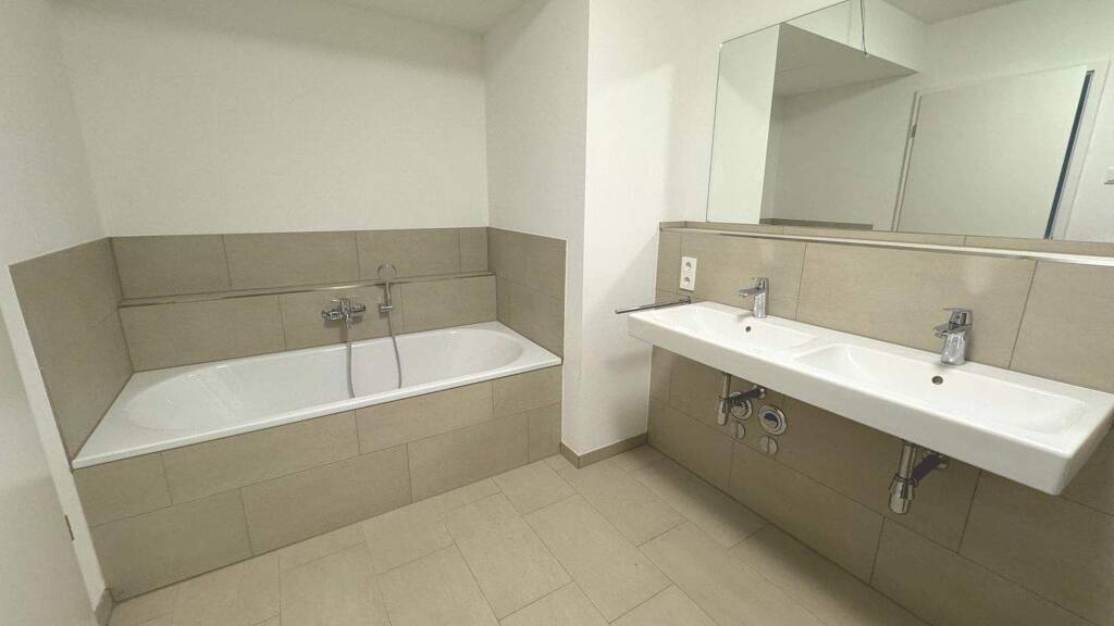 Die komplett ausgestattete Einbauküche verfügt über Ofen, Spülmaschine, Kühl-Gefrierkombination und Umlufthaube, sodass Sie sofort loslegen können. Das elegante Bad punktet mit bodentiefer Dusche, Badewanne und stilvollen Oberflächen. Ein Gäste-WC ist ebenfalls vorhanden. Vinylboden in den Wohn- und Schlafbereichen sorgt für eine moderne, pflegeleichte Gestaltung und angenehmen Gehkomfort.