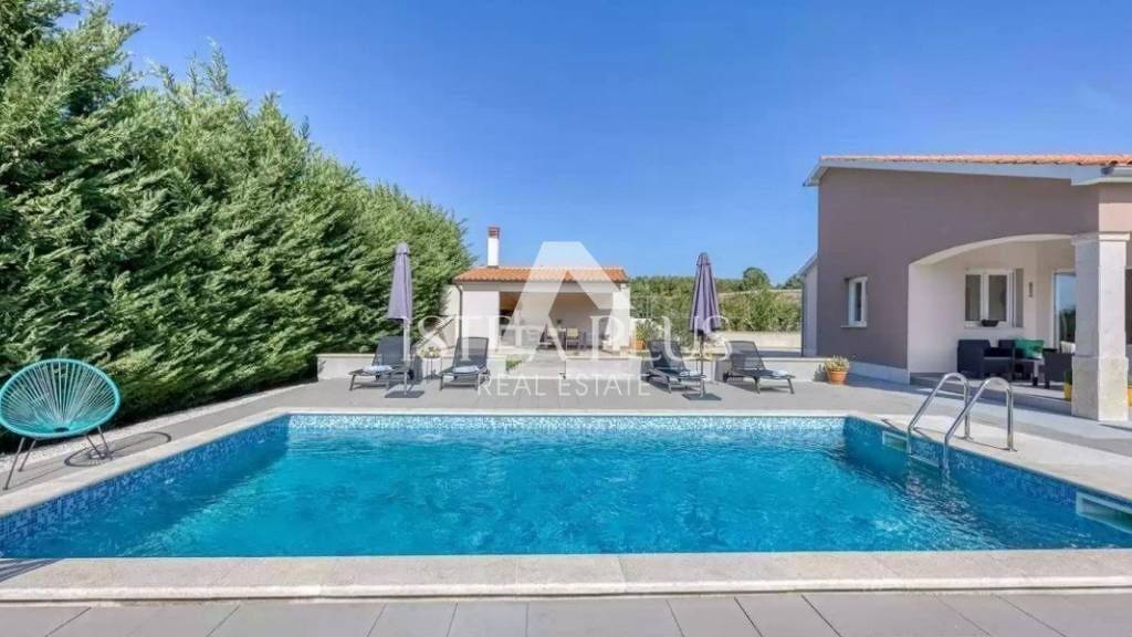 Zum Verkauf steht ein schönes Einfamilienhaus im zeitgenössischen Design mit Swimmingpool und überdachter Sommerküche, ideal zum Genießen einer entspannten Umgebung.