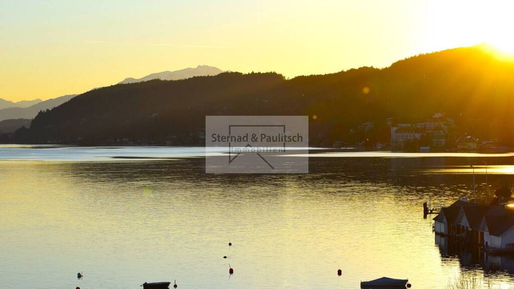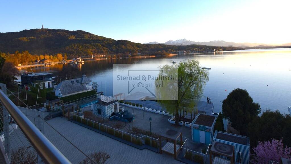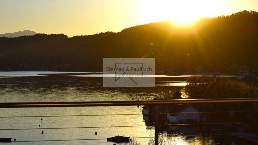 Die großzügige Terrasse eröffnet ein Panorama, das seinesgleichen sucht: vom Pörtschacher Ufer bis hinüber nach Velden - ein Schauspiel, das bei Sonnenuntergang in goldene Farben getaucht wird und unvergleichliche Momente verspricht.