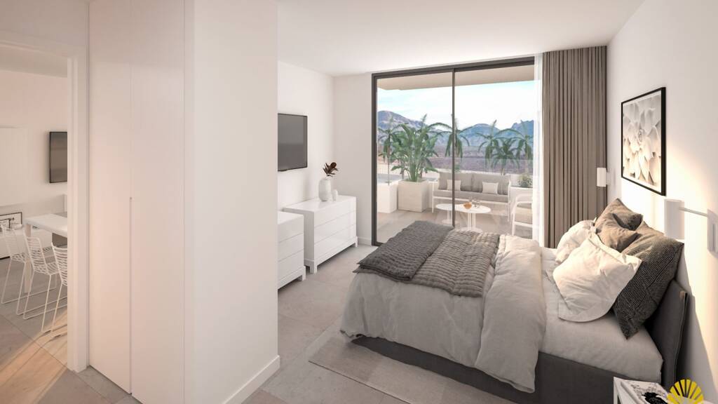 Diese geräumige Wohnung verfügt über ein Schlafzimmer, 2 Badezimmer und ein helles Wohnzimmer mit einer modernen, voll ausgestatteten offenen Küche, die sich auf eine geräumige Terrasse erstreckt, von der aus man einen bezaubernden Blick hat.