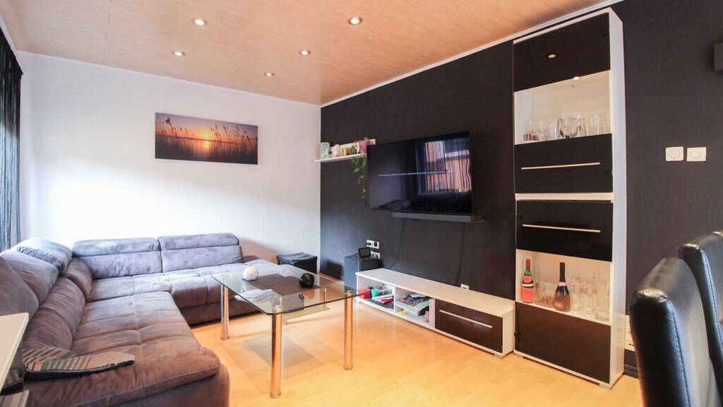 Im Erdgeschoss bildet das Wohnzimmer den Mittelpunkt des Hauses. Direkt angrenzend liegt die Einbauküche, die im Kaufpreis enthalten ist und einen sofortigen Einzug ermöglicht. Ergänzt wird diese Ebene durch ein Tageslichtbad mit Dusche und Badewanne sowie ein weiteres Zimmer, das sich perfekt als Büro oder Gästezimmer nutzen lässt.
