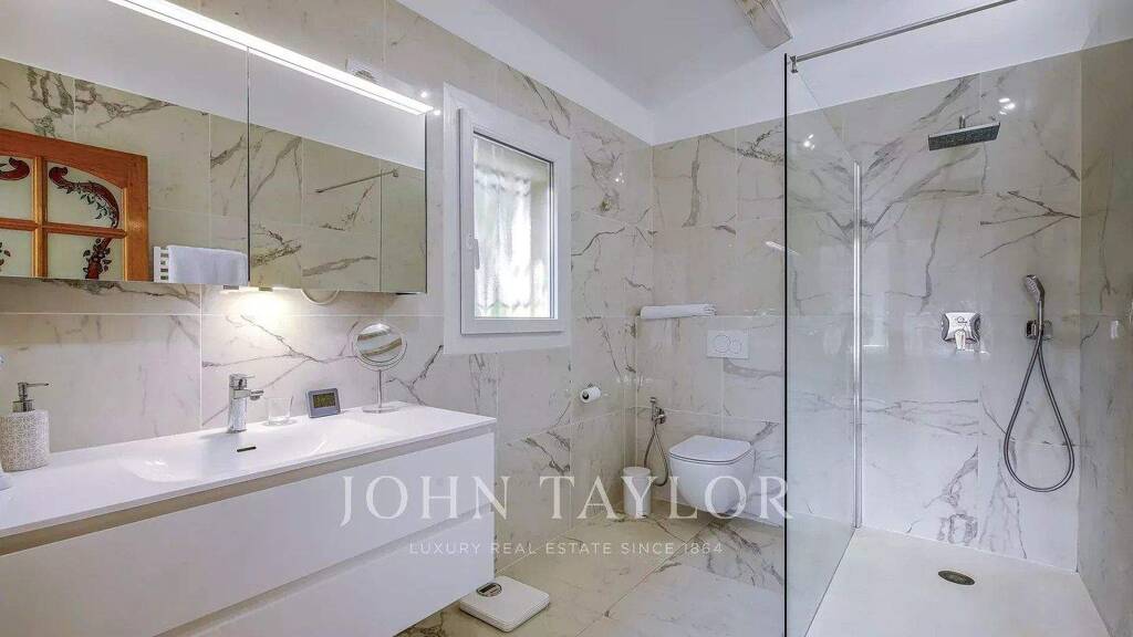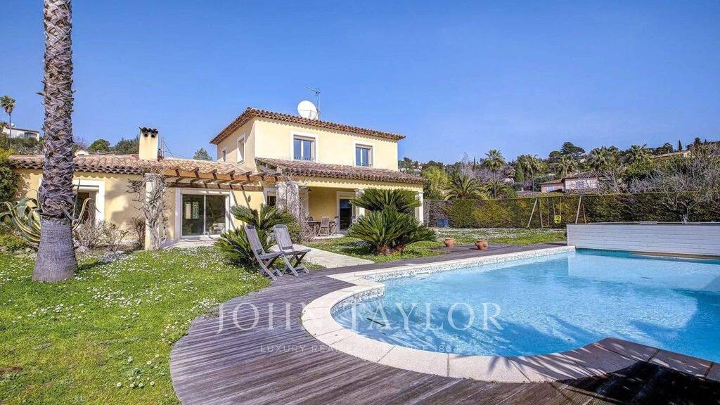 Diese Villa befindet sich in einem beliebten Wohnviertel von Mougins und profitiert von einer angenehmen Umgebung und einer schönen Helligkeit den ganzen Tag über. Das Haus bietet ein geräumiges Wohnzimmer mit Kamin, eine separate Küche, eine Speisekammer sowie eine Waschküche. Ein geräumiges Elternschlafzimmer mit Einbauschränken und Duschbad vervollständigt diese Ebene und bietet einen komfortablen und funktionalen Wohnbereich. Im Obergeschoss finden Sie drei Schlafzimmer und ein Badezimmer. Die Immobilie befindet sich auf einem flachen Grundstück und verfügt über einen Pool, eine Garage und einen Doppelcarport, die ein angenehmes Wohnumfeld bieten.
