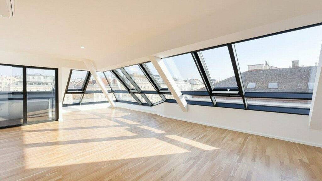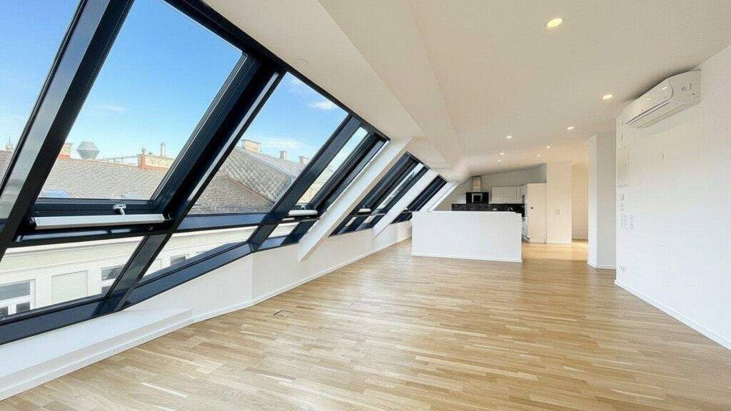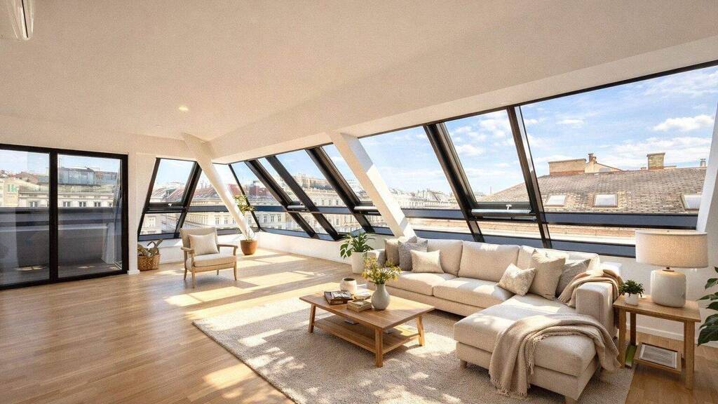 Der eindrucksvolle Wohnsalon mit rund ca. 78?m² und dem traumhaften Fernblick über Wien sowie die ruhige ca. bildet das Herzstück der Wohnung. Der benachbarte Naschmarkt sorgt für kulinarische Erlebnisse mit Stil. Abends genießen Sie hier ein einzigartiges Panorama über das Lichtermeer der Stadt.