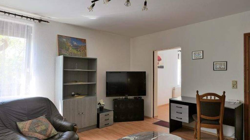### Please note the availability date! Bitte das Verfügbarkeitsdatum beachten! ### preiswertes möbliertes Apartment in Holzhausen nahe Arnstadt; ruhige Wohnlage am Ortsrand; WLAN und PKW-Stellplatz inklusive; Wohnzimmer mit Eckcouch, Sessel, Schrankwand, TV und Schreibtisch; Schlafzimmer mit Doppelbett und Kleiderschrank; kleine separate Küche am Wohnungsflur; Bad mit Dusche, WC und Waschmaschine; Pauschalmiete 590,00 Euro; Vermietung an max. 1 Person; Kaution 800,00 Euro; Endreinigung Mietersache; Mindestmietdauer 3 Monate; Pflichtangaben zum Energieausweis: Energieausweis gültig bis: 01.09.2035; Baujahr Gebäude: 1994; Energieausweis: nach Verbrauch; Energieverbrauch: 172.5 kWh/(m²a); Energieeffizienzklasse: F; Primärer Energieträger: Heizöl EL