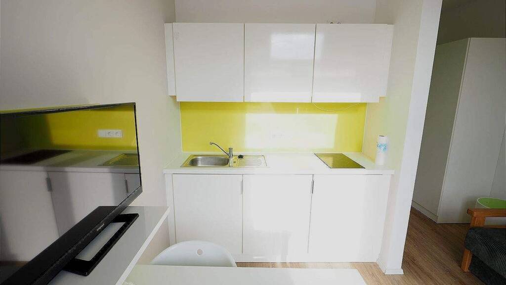 Das gemütliche Objekt verfügt über eine schöne Pantryküche, ein neuwertiges Schlafsofa, Tisch und Stuhl sowie über einen Kleiderschrank und ein Garderobenpaneel. Das moderne Badezimmer ist mit einer Dusche ausgestattet.