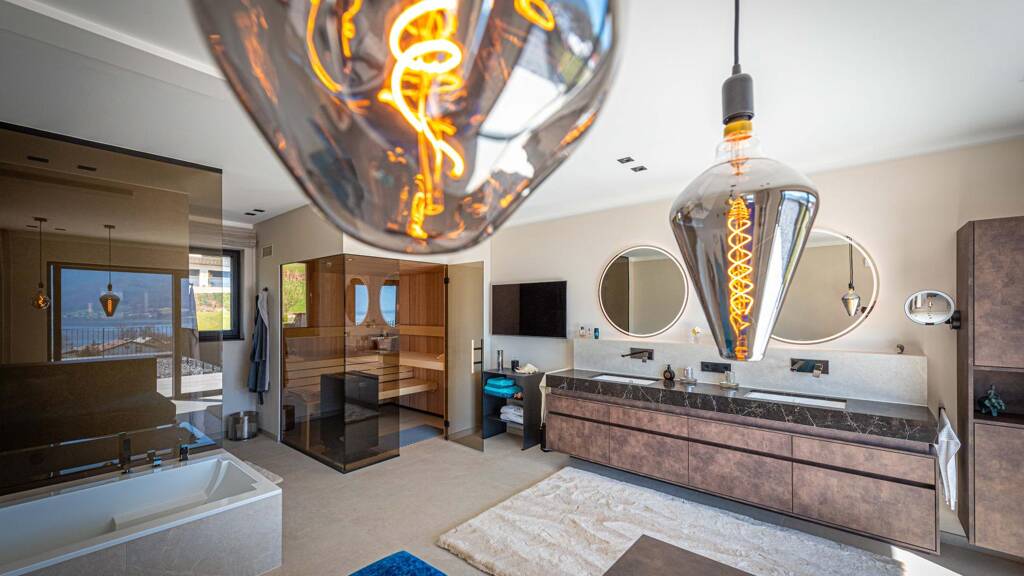 Der luxuriöse Bade- und Wellnessbereich mit integrierter Sauna lädt zum Entspannen und Wohlfühlen ein. Die 3 Haupträume auf dieser Ebene öffnen sich zu einem weitläufigen Außenbereich, der eine Oase der Ruhe schafft und einen traumhaften Panoramablick bietet.