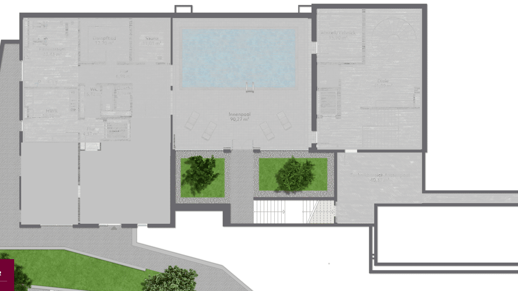Diese Villa bietet einen großzügigen Wellnessbereich, der keine Wünsche offenlässt. Dazu gehören ein beheizter Außenpool mit Gegenstromanlage, ein exklusiver Indoorpool mit LED-Beleuchtung, eine luxuriöse Sauna, ein Dampfbad sowie ein Whirlpool mit Massagedüsen. Der private Ruheraum und eine Erlebnisdusche mit Regeneffekt bieten pure Entspannung in einem einzigartigen Ambiente.