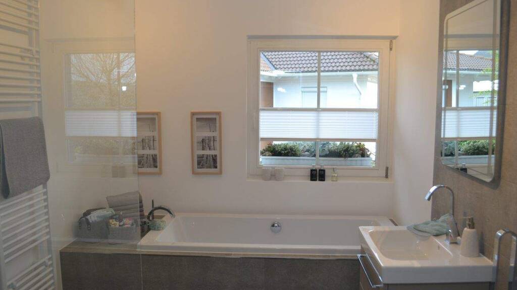 Darüber hinaus überzeugt dein Zuhause durch zahlreiche hochwertige Ausstattungsdetails: dreifach verglaste Fenster mit Aluminiumrollläden, Innentüren mit Zargen, moderne Sanitärobjekte sowie edle Fliesen, Bodenbeläge und Tapeten. Selbstverständlich ist auch die passende Anzahl an Steckdosen von Beginn an eingeplant.