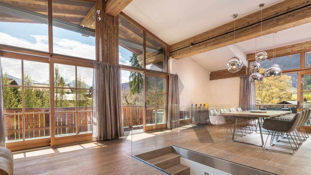 Das Highlight dieser Wohnung ist der über 100 m² große Wohn-/ Ess-/ Küchenbereich im Dachgeschoss mit Sichtdachstuhl. Die hochwertige Küche ist mit Mielegeräten und einem Boraherd ausgestattet und verfügt über eine Back-Kitchen (möblierter Vorbereitungs- und Vorratsraum). Vom Essbereich gelangen Sie auf die Westterrasse mit Blick auf Kitzbühel. Vom Wohnbereich und vom Kaminzimmer gelangen Sie auf den umlaufenden Balkon, von wo Sie Sonne und Ausblick in alle Himmelsrichtungen genießen können.