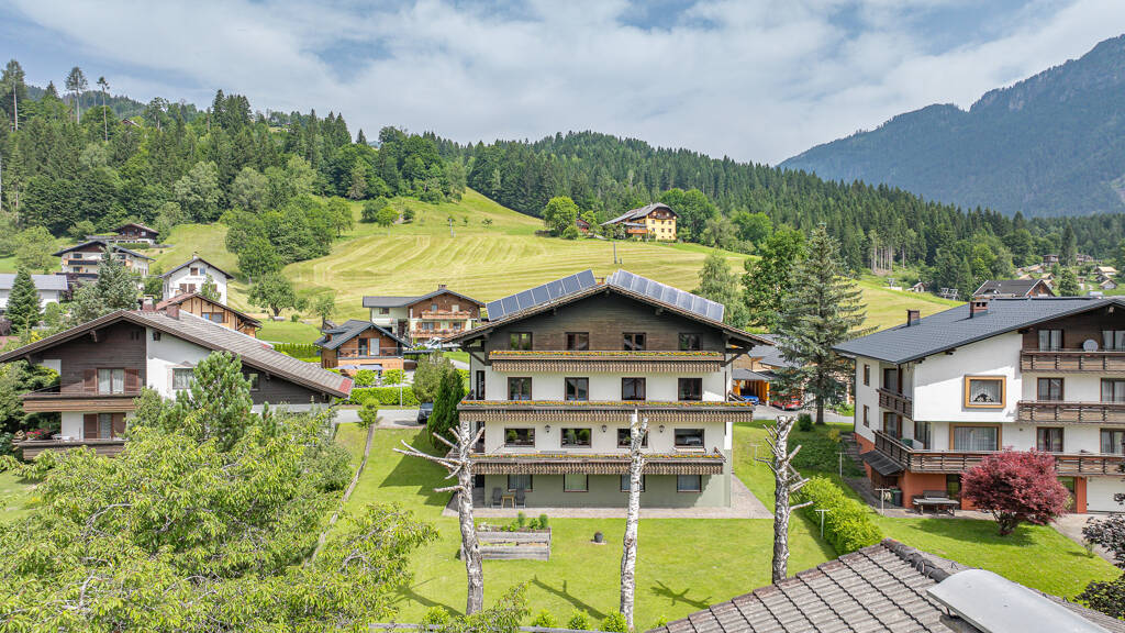 Das großzügige Stiegenhaus verbindet alle Geschosse miteinander. Im ersten Stock befinden sich die ersten Zimmer mit unterschiedlichen Größen und Ausstattung. Von jedem der Apartments gelangt man auf den großen Balkon, welcher einen weitläufigen Panoramablick auf die umliegenden Berge bietet.